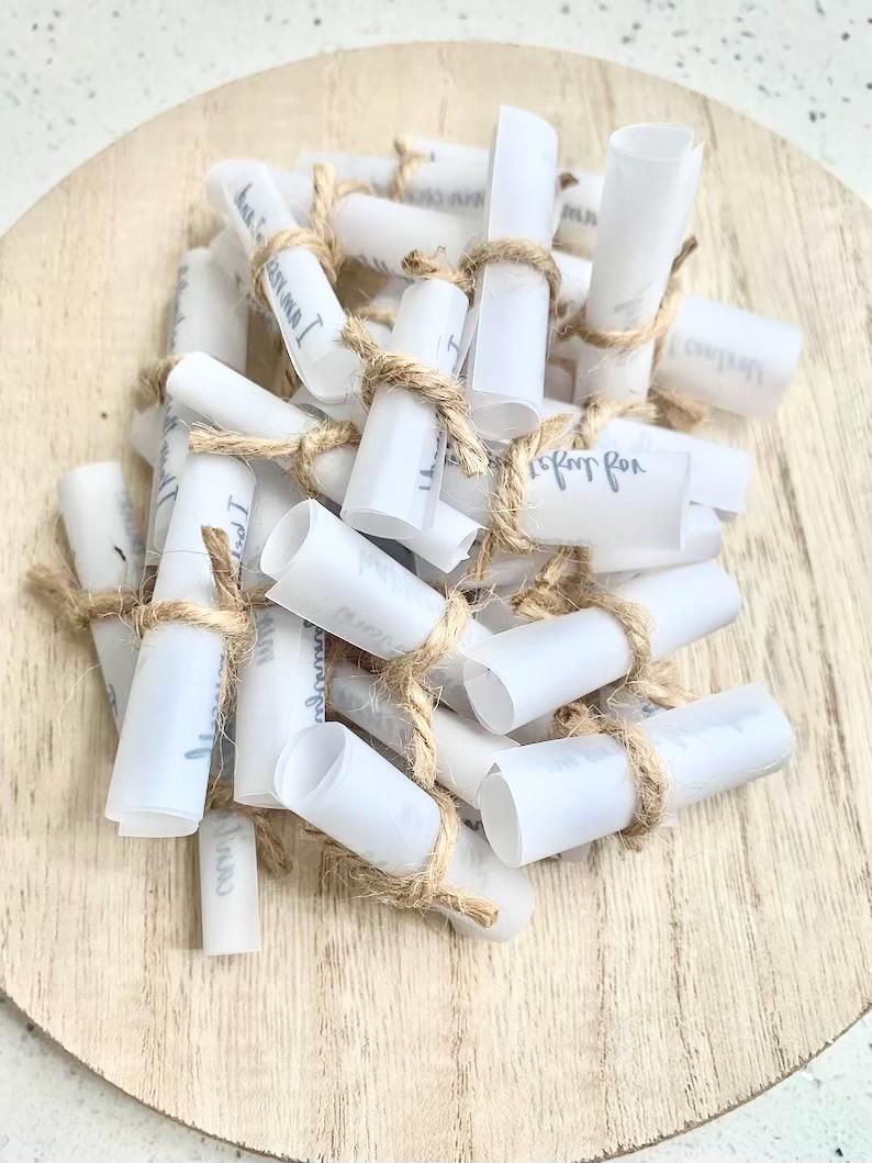 45 hand-rolled inspirational, uplifting messages printed on vellum paper and tied with twine. Messages are placed in a cellophane gift bag and tied with a bow making it ready for gift giving. Perfect gift for birthdays, holidays, teachers, coworkers, or anyone needing a little encouragement.